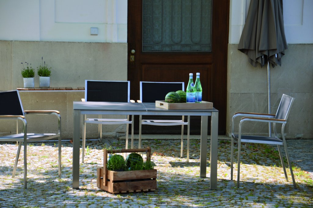Der LUX EXCELL Tisch, eine tolle Kombination aus Edelstahl und wetterfesten Keramikplatten, so schön kann Sommer sein! Verlängerbar durch eine Einlegeplatte von 60 cm auf einer Seite. In drei verschiedenen Farben erhältlich bedarf dieser Tisch keiner besonderen Pflege. Kombiniert mit den LUX Stühlen eine abgerundete Tafel.