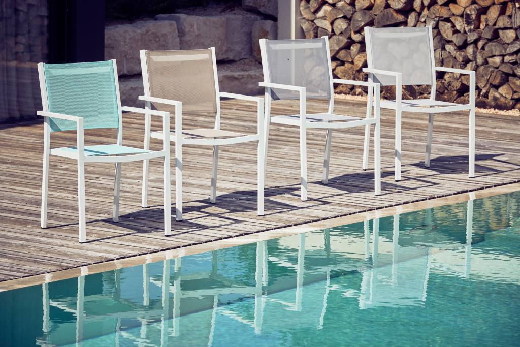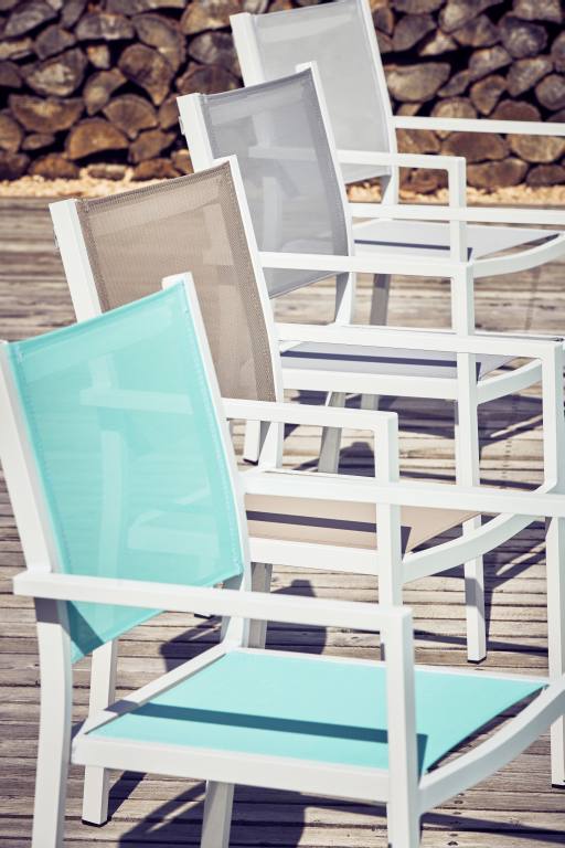 Der Armlehnsessel fiam ARIA mit der Armlehnhöhe von 65 cm ist eine klassische Kombination aus Stahl und Kunststoffgewebe, welches im Sitz- und Rückenbereich zu gemütlichen Stunden einlädt. Sie erhalten diesen Klassiker in den Farben weiss, schwarz, taupe und salbei und ab der neuen Saison 2021 zusätzlich 2-farbig in weiß/aqua, weiß/taupe, weiß/grau und weiß/silbergrau. Je nach Wunsch kann dieser Armlehnsessel perfekt mit dem Tisch NOVA in denselben Farben (einfarbig) erhältlich, kombiniert werden. Mit seinen 4 KG Leichtgewicht und der Stapeleigenschaft nicht nur schön und bequem sondern auch praktisch.